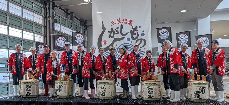 塩釜市魚市場買受人協同組合・鈴木信弘理事長の挨拶と森下千里衆議院議員らの祝辞に続き、鏡割りが行われ、「三陸塩竈ひがしもの」の今季取引スタートを祝しました。